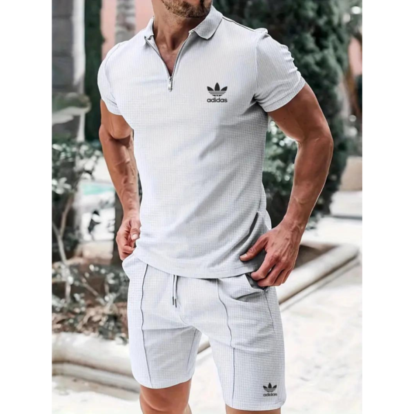 Crafted in a light textured fabric with a subtle grid pattern, this set stands out with its minimalist aesthetic and signature Adidas Trefoil logo. The zip-up collar adds a refined twist to the classic polo, while the shorts’ clean seam lines and drawstring waist ensure a perfect fit — making this set both eye-catching and easy to wear.