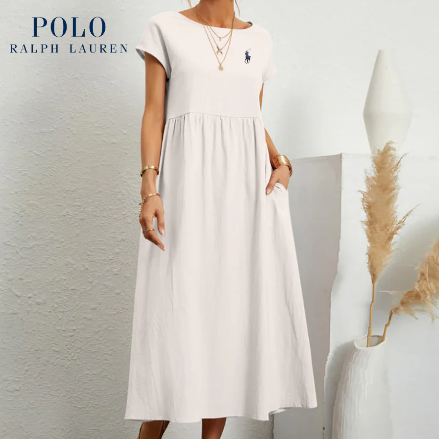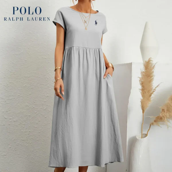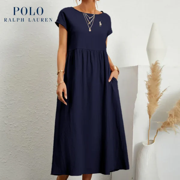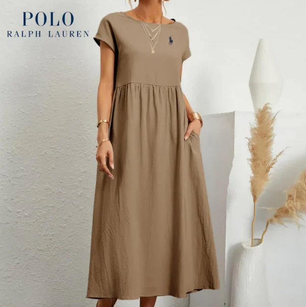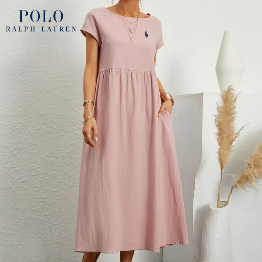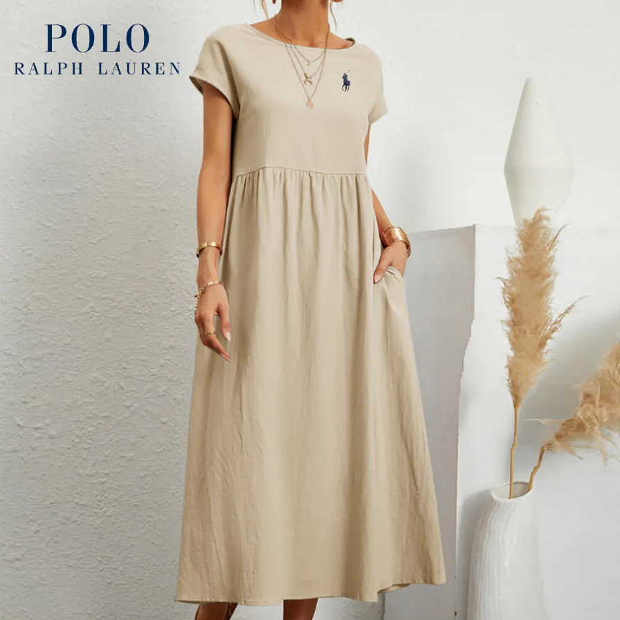 This Ralph Lauren – New Elegant Dress embodies a graceful silhouette with its relaxed, flowing structure. The soft drape from the empire waistline enhances natural movement, offering a timeless shape that flatters all body types. Its minimalist design allows for versatile wear, making it ideal for both casual outings and refined occasions.