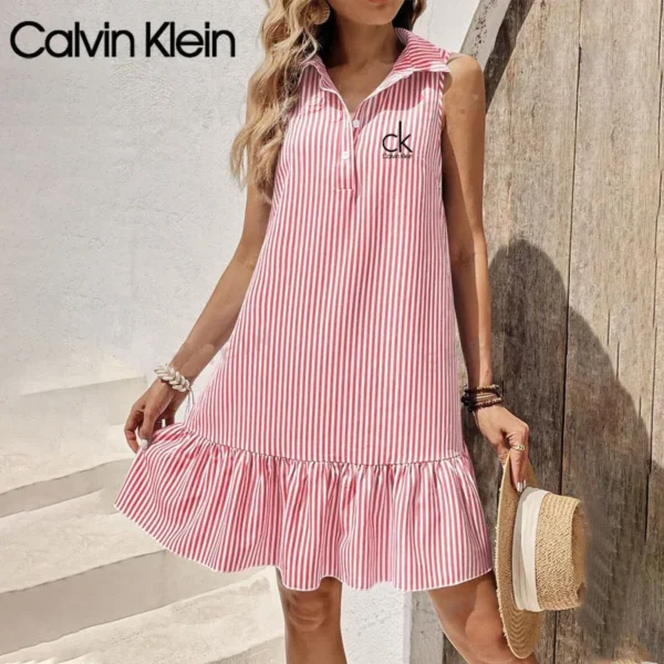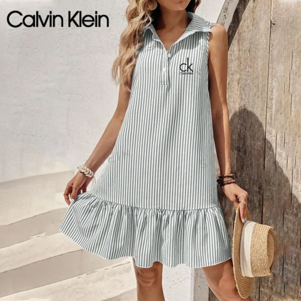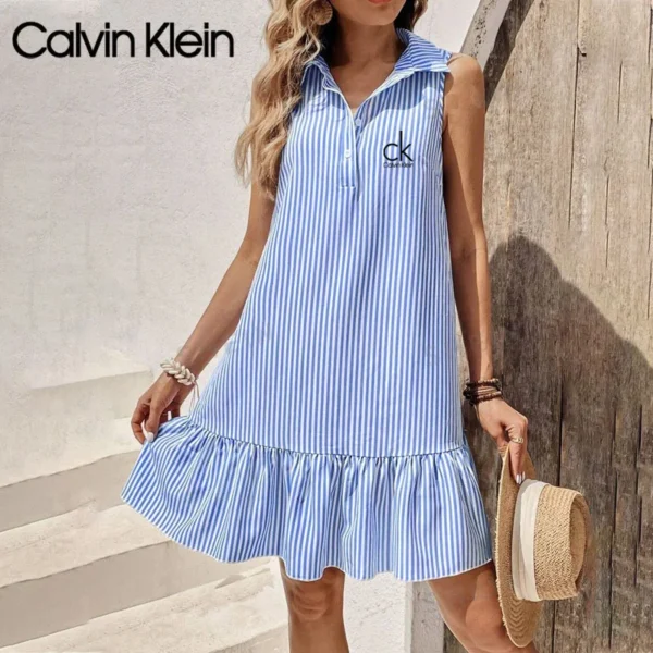 Step into summer with effortless elegance in this Calvin Klein – New Elegant Dress. Featuring a refreshing white vertical stripes, this piece brings a timeless nautical vibe with a modern twist. The clean lines and sleeveless cut offer a relaxed yet refined silhouette, making it the perfect outfit for sunny strolls and beachside brunches.